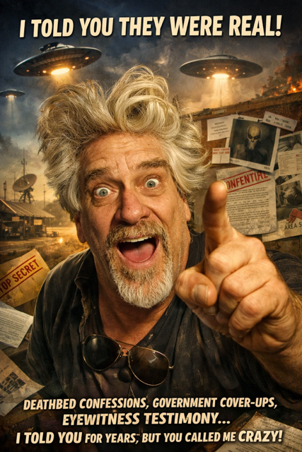 Because for me, this is not some abstract, casual, entertainment-level idea. This is not, “Hey man, wouldn’t it be wild if aliens were real?” I am way past that. I am not sitting around wondering if maybe there might be something out there. I know what I know. I have watched this too long. I have had inside information. I have had my own experiences. I have seen things. I have told people for years that this was real, that this was not bullshit, that this was bigger than people wanted to admit. I have told people about things I saw. I have told people I asked them to reveal themselves to me and that they did. I have been that guy. Randy Quaid from *Independence Day*, motherfucker. I told you they were real. I told you. You laughed, you shrugged, you rolled your eyes, you put the tinfoil hat on me, and now look where we are.